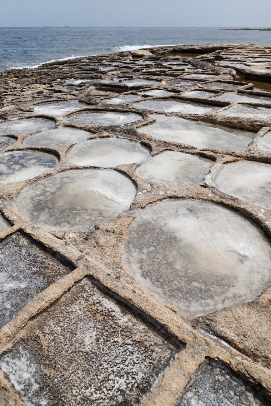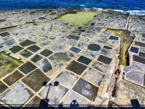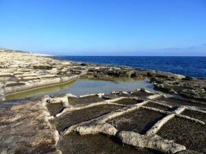 These salt pans are traditional sea salt evaporation pondsβ€”basically shallow rock reservoirs cut into the flat coastal rock. During high tide, seawater fills the pans. Then, under the Mediterranean sun and breeze, the water evaporates and leaves behind crystallised salt. This process is the same method used for centuries in Malta and across the Mediterranean for harvesting sea salt.