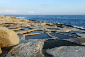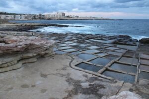 The salt pans in Marsaskala are a distinctive and historic feature of the town’s seaside landscape on the southeastern coast of Malta. They form part of a network of shallow, square-edged pools carved directly into the coastal limestone along rock ledges, especially around Ε»onqor Point and stretching toward St. Thomas’ Bay.